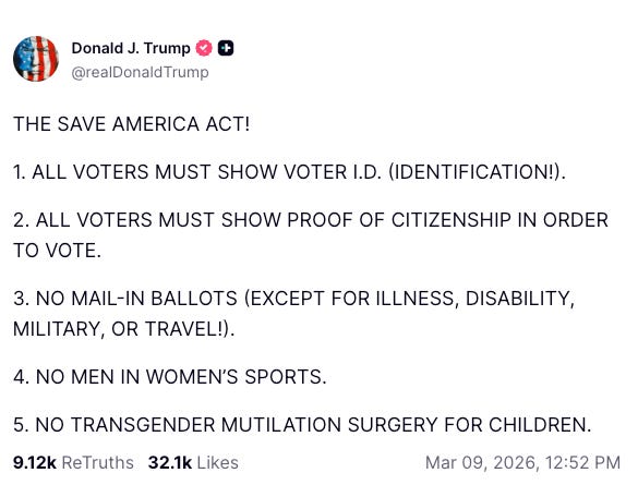 Sen. Mike Lee (via X) — “Let’s turn this around — by passing SAVE America. Pass it on.” — March 14, 2026