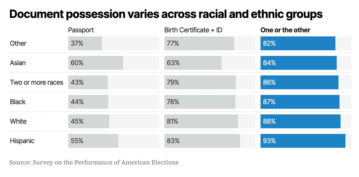 The Bipartisan Policy Center — a nonpartisan think tank — confirmed that Black respondents are about as likely as white respondents to report having documentary proof of citizenship. Ironically, Hispanic voters had the highest reported rates of any racial group.